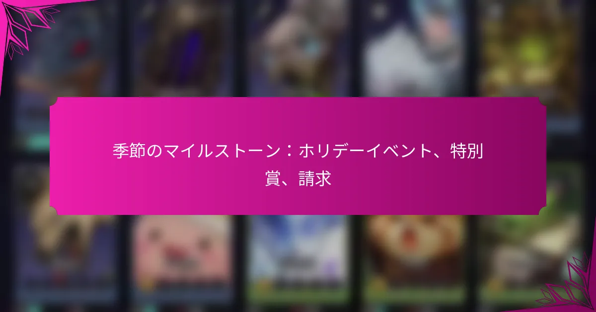 限定マイルストーンイベントでは、プレイヤーが通常の賞品よりも価値のある希少な報酬を獲得できるチャンスが提供されます。これらの報酬を確実に獲得するためには、特定の手順に従い、締切に注意を払うことが重要です。さらに、各報酬には有効期限があるため、これらのタイムラインについて把握しておくことが、報酬を逃さないために不可欠です。 限定マイルストーンイベントの希少な報酬とは? 限定マイルストーンイベントの希少な報酬は、プレイヤーが特定の達成やマイルストーンを通じて獲得できる独占的な賞品です。これらの報酬は通常の報酬よりも価値が高く、入手が難しいため、参加者にとって非常に魅力的です。 利用可能な希少な報酬の種類 希少な報酬はさまざまな形で提供され、プレイヤーにユニークな利点をもたらします。一般的な種類には以下が含まれます: 独占アイテム:通常のゲームプレイでは入手できないユニークな装備やコスメティック。 ゲーム内通貨:アップグレードや購入に使用できる大きな金額の通貨。 期間限定ブースト:パフォーマンスや経験値獲得を向上させる一時的な強化。 各希少な報酬の価値 希少な報酬の価値は、その種類や獲得に必要な努力に応じて大きく異なる場合があります。以下は典型的な価値の比較です: 報酬タイプ 推定価値 独占アイテム 高 – ゲームプレイを大幅に向上させる可能性がある ゲーム内通貨 中 – 通常は数百のゲーム内ドルに相当 期間限定ブースト 変動 – 小規模から大規模なブーストまで様々 希少な報酬と通常の報酬の違い 希少な報酬は、その独占性と価値により通常の報酬と際立っています。通常の報酬はしばしば入手が容易で、すべてのプレイヤーが利用可能ですが、希少な報酬は特定の達成やマイルストーンを必要とし、選ばれたグループのみがアクセスできる場合があります。 さらに、希少な報酬は、ゲームプレイに大きな影響を与えるような強化された能力やユニークなアイテムを提供することが多いです。一方、通常の報酬には、ゲームにあまり影響を与えない基本的なアイテムや少量の通貨が含まれることがあります。 過去の希少な報酬の例 歴史的に、限定マイルストーンイベントではいくつかの注目すべき希少な報酬が登場しました。例としては: 伝説の剣:攻撃力を大幅に向上させる独占的な武器。 金貨:大規模なアップグレードを可能にする希少な通貨報酬。 経験値ブースト:限られた時間内に得られる経験値を倍増させる一時的なブースト。 希少な報酬の資格基準 希少な報酬を獲得するには、プレイヤーは通常、イベント主催者が設定した特定の基準を満たす必要があります。これには、特定のマイルストーンに到達すること、チャレンジを完了すること、または指定された期間内に参加することが含まれる場合があります。 プレイヤーはまた、一部の希少な報酬にはアカウントの状態や過去のイベント参加に基づく制限があることを認識しておくべきです。希望する報酬を獲得できるように、各イベントの資格要件を確認することが重要です。 限定マイルストーンイベントから報酬を獲得するにはどうすればよいですか? 限定マイルストーンイベントから報酬を獲得するには、特定の手順と締切に注意を払う必要がある簡単なプロセスが含まれます。獲得プロセス、潜在的な落とし穴、必要なアクションを理解することで、これらの報酬を成功裏に取得する可能性を高めることができます。 報酬を獲得するためのステップバイステッププロセス 限定マイルストーンイベントから報酬を獲得するには、まず関連するプラットフォームでアカウントにログインします。限定マイルストーンがリストされているイベントセクションに移動し、参加した特定のイベントを選択します。 次に、利用可能な報酬を確認し、すべての資格基準を満たしていることを確認します。受け取りたい報酬に関連するクレームボタンをクリックします。選択を確認し、クレームを提出するためのプロンプトに従います。 最後に、クレームが処理されたことを確認するために、通知やメールに注意を払ってください。この確認には、報酬を受け取る予定の日時に関する詳細が含まれることが一般的です。 報酬を獲得する際の一般的な落とし穴 一般的な落とし穴の一つは、クレームの締切を逃すことです。各限定マイルストーンイベントには報酬を獲得するための特定の期間があり、この期間内に行動しないと報酬を失うことになります。 別の問題は、資格要件を満たさないことから生じます。クレームを試みる前に、必要なタスクをすべて完了したり、必要なマイルストーンに到達したりしていることを確認してください。イベントの基準に対して進捗を再確認してください。 最後に、技術的な問題に注意してください。サーバーの問題や接続の問題により、クレームが正しく処理されないことがあります。常にクレームが正常に提出されたことを確