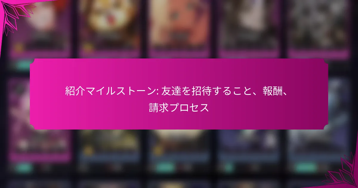 「Seven Knights Idle Adventure」では、紹介マイルストーンに到達するには友達をゲームに招待する必要があり、あなたと新しいプレイヤーの両方にエキサイティングなインセンティブが与えられます。ソーシャルメディア、メール、メッセージアプリを通じてユニークな紹介リンクやコードを共有することで、簡単に情報を広め、報酬を得ることができます。これらの報酬は、成功した紹介の数に応じてボーナス、割引、または独占アクセスを提供し、ゲーム体験を向上させることができます。 「Seven Knights Idle Adventure」における紹介マイルストーンとは? 「Seven Knights Idle Adventure」における紹介マイルストーンは、プレイヤーが友達をゲームに招待することで達成する特定の成果です。これらのマイルストーンは、プレイヤーのエンゲージメントを促進し、紹介者と新しいプレイヤーの両方にさまざまなインセンティブを提供することを目的としています。 紹介マイルストーンの定義と目的 紹介マイルストーンは、プレイヤーが他の人を「Seven Knights Idle Adventure」に招待することで達成できるベンチマークです。これらのマイルストーンの主な目的は、コミュニティの成長を促進し、ゲーム内でのプレイヤーの相互作用を強化することです。 これらのマイルストーンに到達することで、プレイヤーはゲーム体験を向上させる報酬をアンロックでき、既存のプレイヤーと新しいプレイヤーの両方にとってゲームをより楽しく、報酬を得られるものにします。 紹介マイルストーンが全体の報酬プログラムにどのように組み込まれているか 紹介マイルストーンは、「Seven Knights Idle Adventure」の広範な報酬プログラムの重要な部分です。これらは、プレイヤーがゲームに参加し、新しいユーザーを招待するための追加のインセンティブを提供することで、他の報酬システムを補完します。 プレイヤーが紹介マイルストーンに到達すると、ゲームプレイを向上させるために使用できるさまざまな報酬、例えばゲーム内通貨、独占アイテム、またはボーナスを得ることができます。この統合により、すべてのプレイヤーにとってよりダイナミックで魅力的な環境が作られます。 紹介マイルストーンプロセスの主要な要素 紹介マイルストーンプロセスは、プレイヤーが知っておくべきいくつかの主要な要素で構成されています。まず、プレイヤーはユニークな紹介リンクまたはコードを使用して友達を招待する必要があります。このリンクは、新しいプレイヤーの登録と活動を追跡します。 一定数の友達が参加し、特定の基準を満たすと、紹介者は報酬を請求できます。これらの基準には、チュートリアルを完了することや、ゲーム内で特定のレベルに到達することなどのアクションが含まれる場合があります。 紹介マイルストーンに関連する一般的な用語 紹介者: 新しいプレイヤーを招待する既存のプレイヤー。 紹介リンク: 招待を追跡するユニークなURL。 マイルストーン: 紹介に関連する特定の目標または成果。 報酬: 紹介マイルストーンに到達するために与えられるインセンティブ。 これらの用語を理解することで、プレイヤーは紹介マイルストーンプロセスをより効果的にナビゲートし、報酬を最大化することができます。 紹介マイルストーンに参加することの利点 紹介マイルストーンに参加することは、プレイヤーにいくつかの利点を提供します。まず、プレイヤーはゲームプレイ体験を向上させる貴重な報酬を得ることができます。これらの報酬には、ゲーム内通貨や、通常は入手が難しいユニークなアイテムが含まれる場合があります。 さらに、友達を招待することで、より活気のあるゲームコミュニティが形成され、プレイヤーが体験や戦略を共有できるため、ゲームがより楽しくなります。この社会的側面は、エンゲージメントの向上や、より報酬を得られる全体的な体験につながります。 友達を紹介プログラムに参加させるにはどうすればよいですか? 友達を紹介プログラムに招待するには、通常、あなたと友達の両方に報酬を与えるユニークな紹介リンクまたはコードを共有する必要があります。このプロセスは、ソーシャルメディア、メール、メッセージアプリなど、さまざまなチャネルを通じて行うことができ、情報を広めるのが簡単です。 友達を招待するためのステップバイステップガイド 紹介プログラムプラットフォームにアカウントでログインします。 通常、ユニークな紹介リンクまたはコードが表示される紹介セクションを見つけます。 ソーシャルメディア、メール、またはダイレクトメッセージなど、好みの共有方法を選択します。 友達に紹介リンクまたはコードを送信し、サインアップを促します。 プラットフォームを通じて紹介を監視し、報酬やエンゲージメントを追跡します。 招待に必要なツールとリンク 友達を効果的に招待するには、紹介プログラムアカウントへのアクセスとユニークな紹介リンクまたは